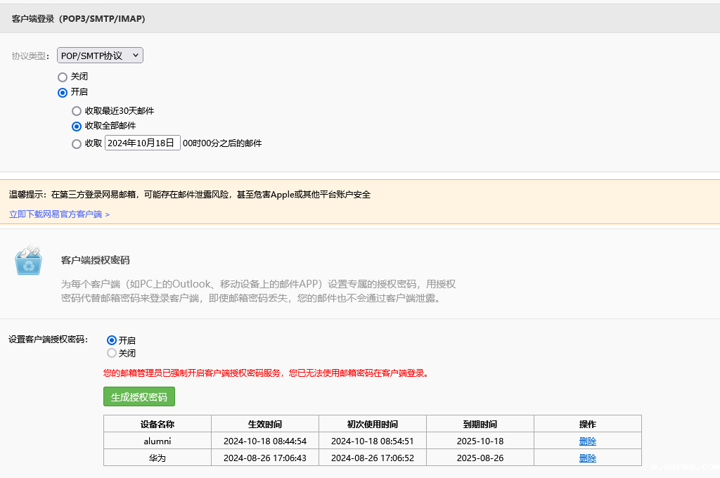2. 客户端授权码,点“生成授权码”为alumni邮箱生成一个新的客户端授权码,复制保存好。