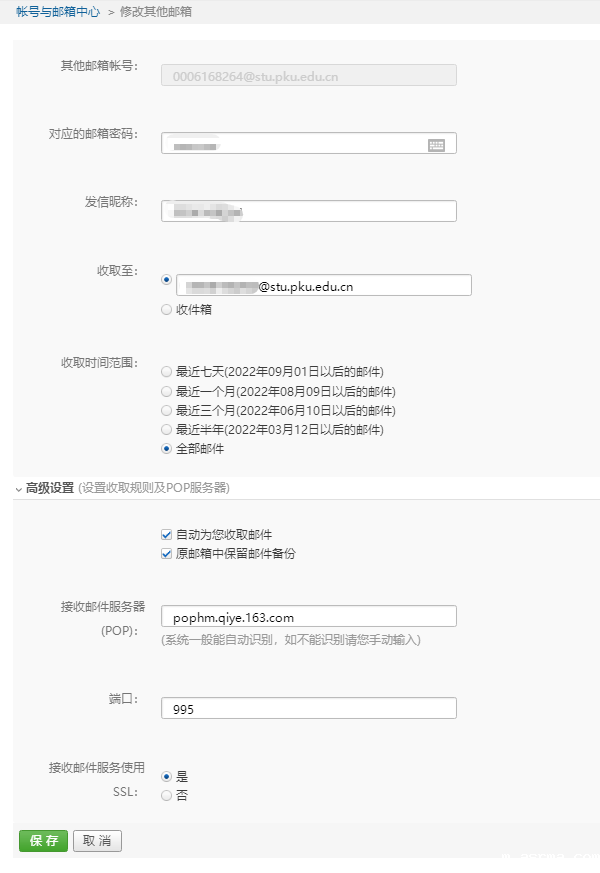 “高级设置”中“端口”务必写995,“接收邮件服务使用SSL”务必选“是”。