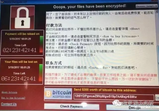 5月12日,全球爆发电脑勒索病毒,我国多所大学校园网遭受攻击。攻击导致个人电脑的重要文件被病毒加密。由于攻击者使用了高强度的加密算法,一旦中招难以破解,被攻击者若想恢复文件需支付高额赎金。受攻击的电脑会显示如下页面。
