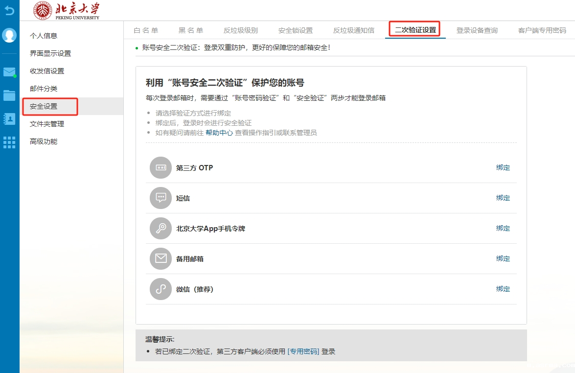 二次验证支持手机微信、短信、第三方OTP、北大App手机令牌和备用邮箱等五种方式,强烈建议至少选择两种方式,以便一种方式出现问题的时候能够用另一种方式的登录。启用方法如下: